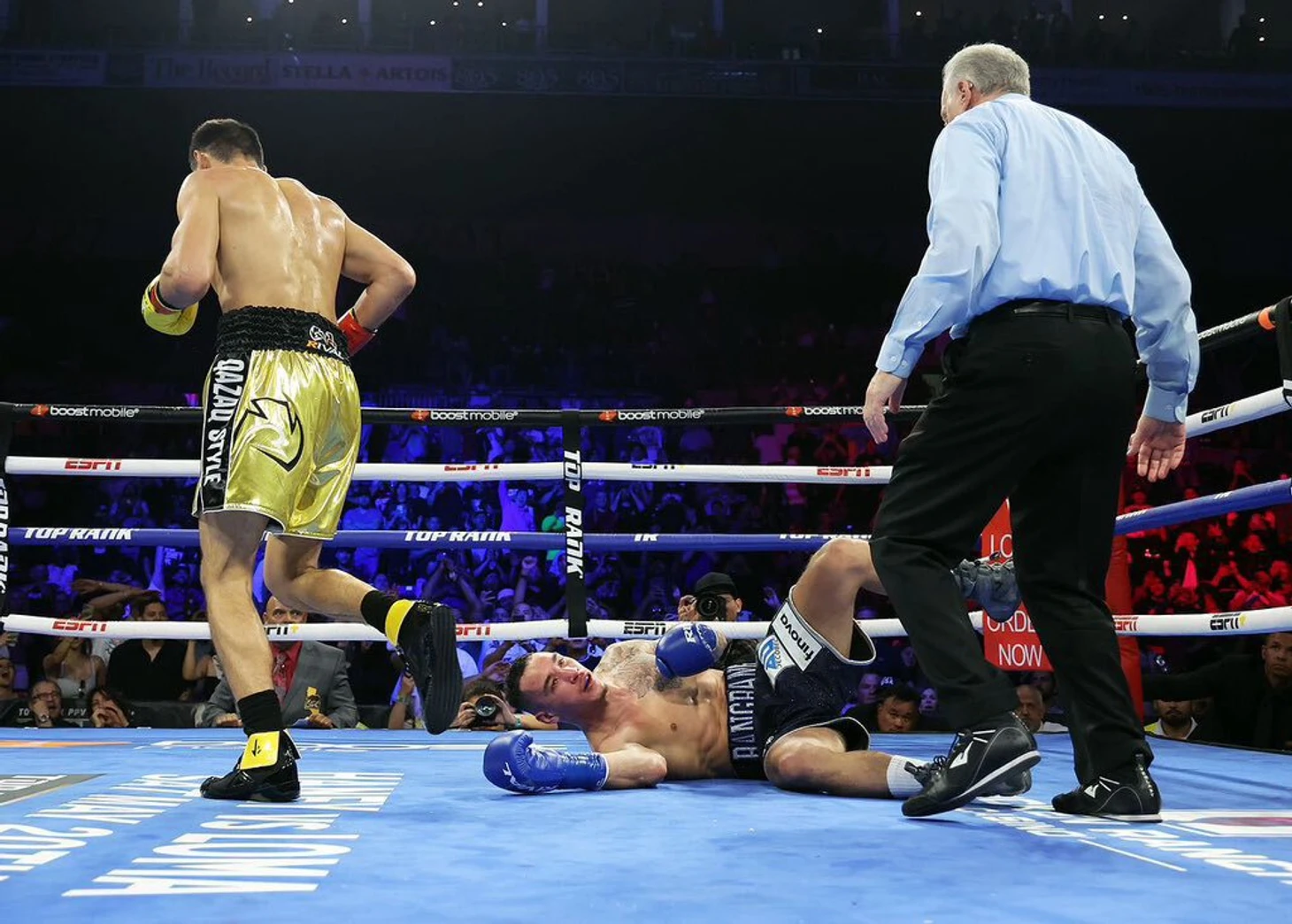 Канадец чудом держался на ногах после двух нокдаунов. В результате бой завершился тяжелым нокаутом: Алимханулы левым боковым не оставил шансов канадскому боксеру.