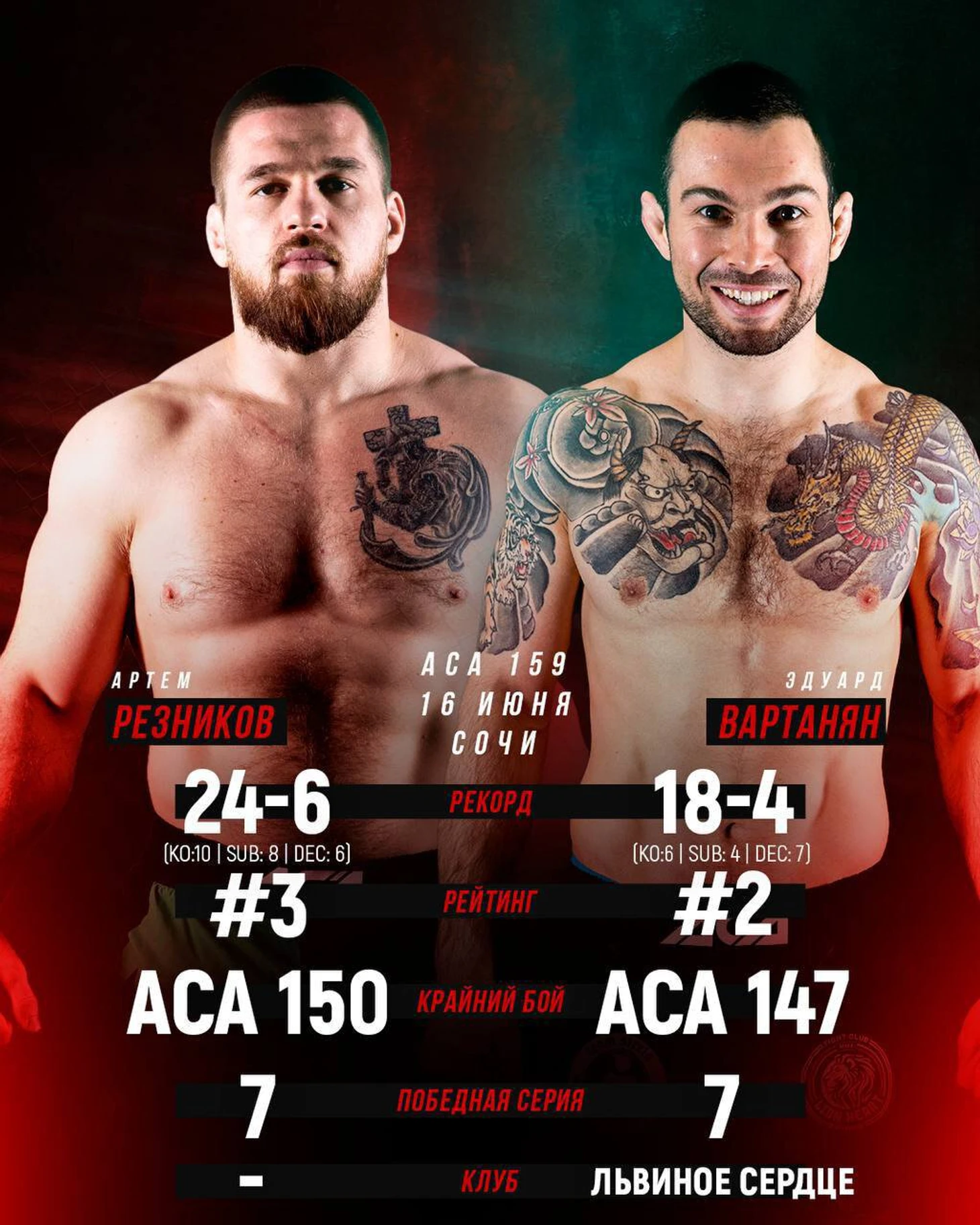В рамках турнира АСА 159 в Сочи пройдет один из самых ожидаемых боев лета – финал Гран-при в легком весе Артем Резников – Эдуард Вартанян.
