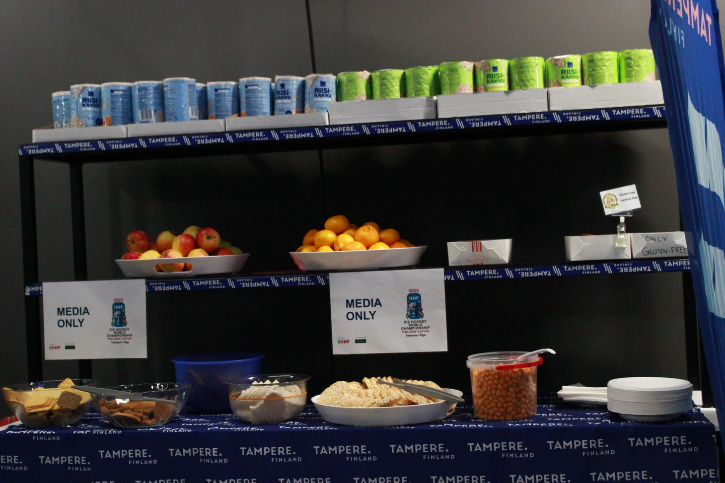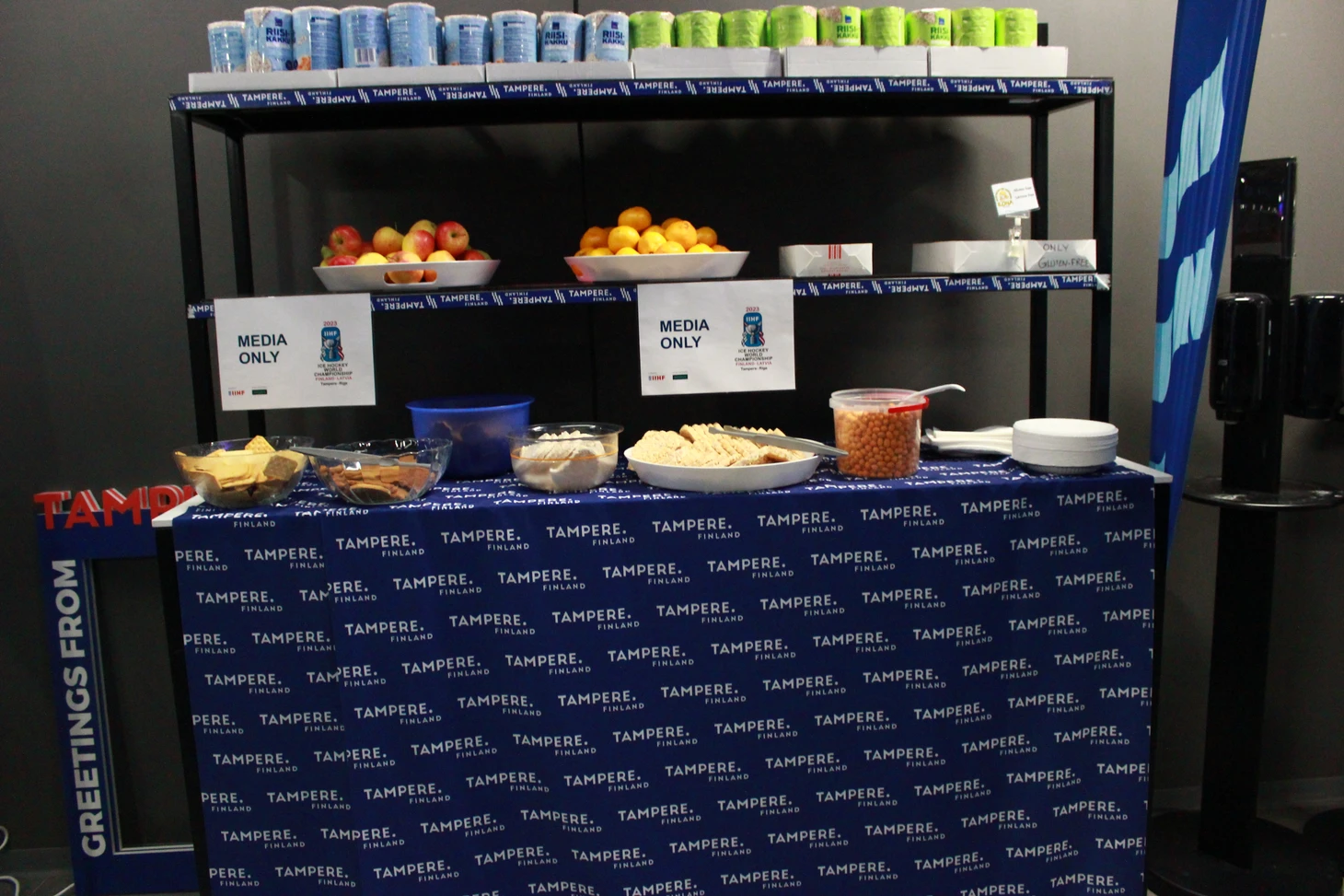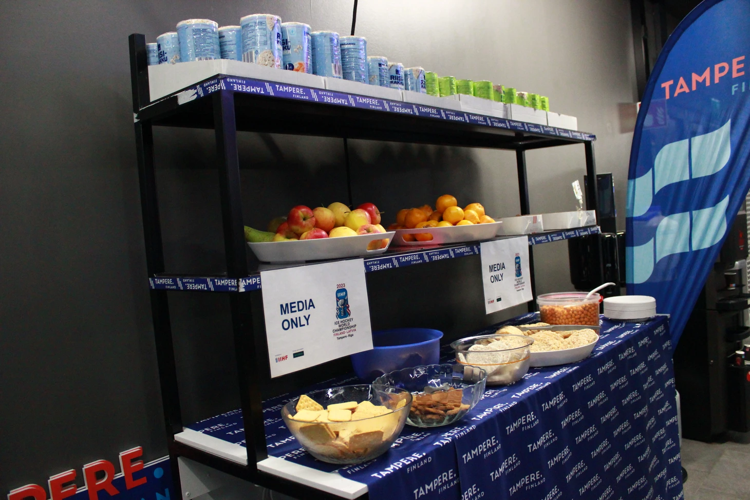 Сам медиацентр огромный, со множеством столов и удобных мягких стульев для журналистов и фотокорреспондентов. Практически везде установлены огромные телевизионные экраны, на которых велась трансляция матчей. К услугам журналистов кофе-машины, чай, выпечка, фрукты, сладости, питьевая вода, салфетки – только сосредотачивайся на хоккее и твори. Внимательные волонтеры вовремя наполнят коробки с едой. Журналисты из разных стран писали свои заметки и репортажи в комфортных условиях, а выход в ложу для прессы сразу же в шаговой доступности. В ложе оборудованы столы для ноутбуков, розетки и беспроводной интернет работал без сбоев. Однозначно, в плане организации медиа-центра финны в Тампере задали высокую планку.