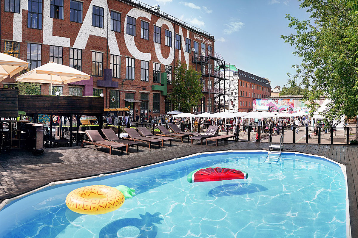 Территория бывшей фабрики стала новым домом для пляжного островка с шезлонгами у бассейна, песчаной волейбольной площадки и уютного бара. Комплекс выделяется зоной активного отдыха. Вход свободный, но придется заплатить за полотенце, аренду шезлонга, настольных игр и площадки для занятия спортом.