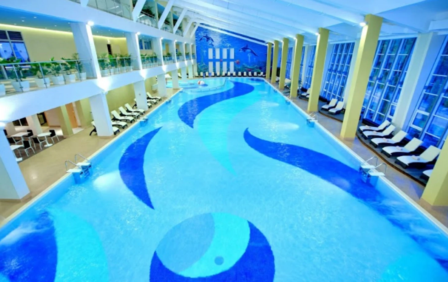 В гостиничном комплексе расположен самый большой подогреваемый бассейн. В нем регулируется искусственное течение и есть зона джакузи. На территории гостиницы для гостей предложено 8 бассейнов: