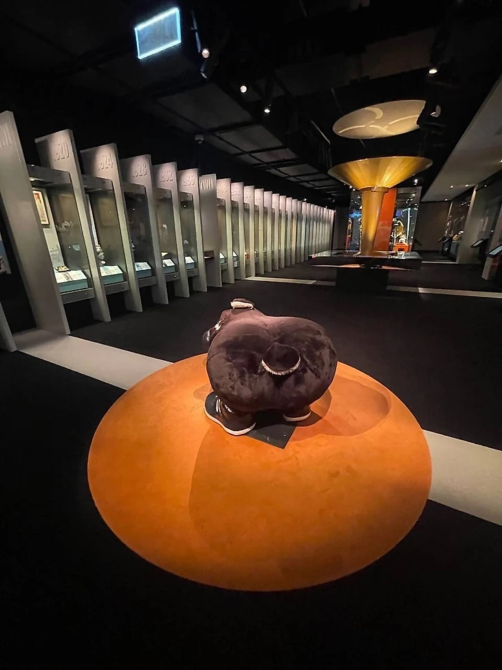 В первом же зале, посвященном олимпийской истории Австралии, нас встретил вомбат Фатсо – неофициальный талисман Игр 2000 года в Сиднее. Вернее, самая впечатляющая его часть. Этот вомбат был создан местным карикатуристом в качестве антиталисмана игр, но быстро полюбился болельщикам и стал чуть ли не известнее основных талисманов.