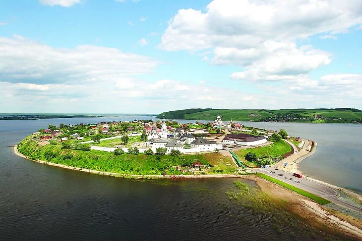 Остров Свияжск — бывшая крепость на берегу Волги. Крепость построена по приказу царя Ивана Грозного. Сооружение позволило Грозному взять Казань. Позже здесь образовался город. В современное время остров одно из самых популярных мест у туристов. В крепости можно прогуляться по мощеным улочкам, зайти в старинные монастыри. В Успенском монастыре находится прижизненный портрет Ивана Грозного. Периодически в Свияжске проводят исторические реконструкции.