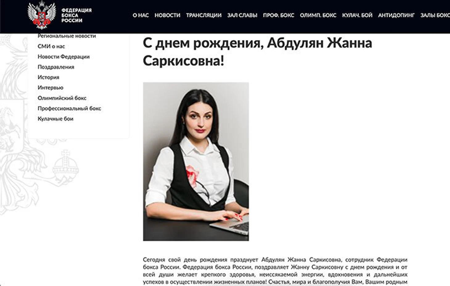 Вот, например, Федерация бокса России поздравляет «сотрудника» Жанну Абдулян с днем рождения.