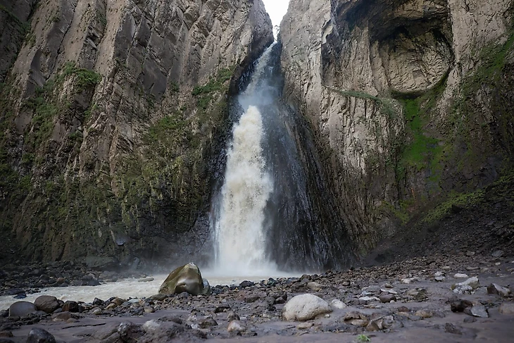 40-метровый Султан в летнее время отличается серым оттенком воды. Такой цвет дань глина и песок. Их приносит поток воды, вымывающий талыми водами горную породу.