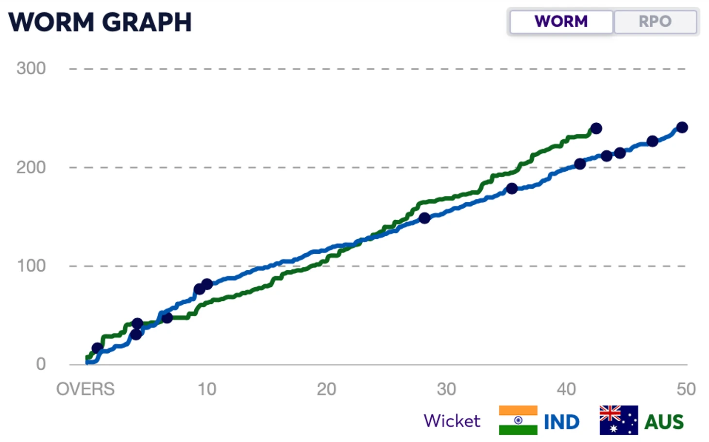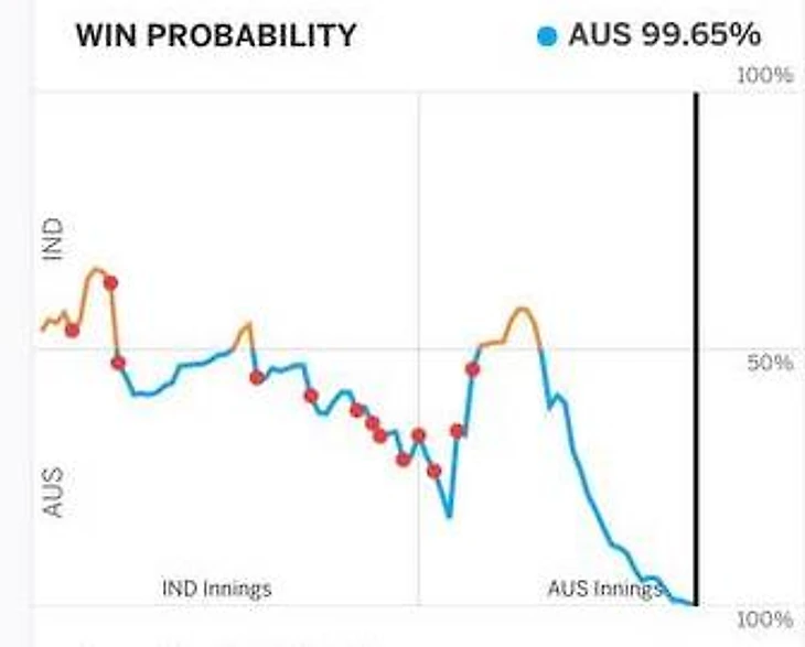Но затем, сборная Австралии решила перестать ошибаться, и её лучшие бэттеры, упомянутый Трэвис Хэд и Марнус Лабушань (который, кстати, родился и воспитывался в Южной Африке) поймали кураж и вдвоём заставил план Индии по уикетам кануть в небытие. Австралия всего за 43 подхода (овера) успела набрать необходимое для их победы 241 очко (у Индии на тот момент было всего 3 уикета), после чего игра была объявлена завершённой, а Австралия стала чемпионом. Вот как выглядел график вероятности победы каждой команды на протяжении всего матча.