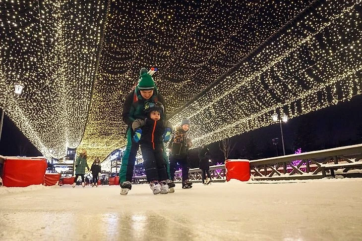 Впечатляет и антураж. На протяжении всего катка горят гирлянды, звучит новогодняя музыка. На протяжении всей набережной работают кафе, рестораны и закусочные, куда можно зайти сразу после активного отдыха. Тут же неподалеку работает детский снежный городок, где можно полюбоваться различными скульптурами, праздничными декорациями и пряничными домиками. Интересно здесь бывает не только детям, но также их родителям. Правда, вход в городок платный. Детский билет обойдется в триста рублей, взрослый — четыреста.