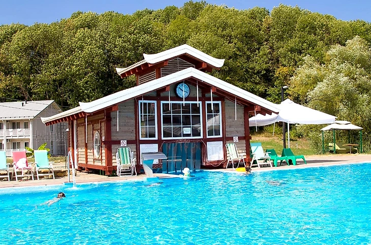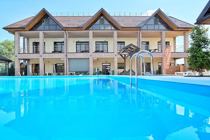 Приехать можно и на один день, все услуги будут доступны без ограничений. В отеле работает кафе, рядом расположена эко-ферма, отдельные бассейны для взрослых и детей с фонтанами и гидромассажным оборудованием. Отдыхающие могут записаться на спа-процедуры и массаж. Детям тоже не будет скучно, для них оборудован клуб. Пикник можно устроить в беседках с мангальными зонами.
