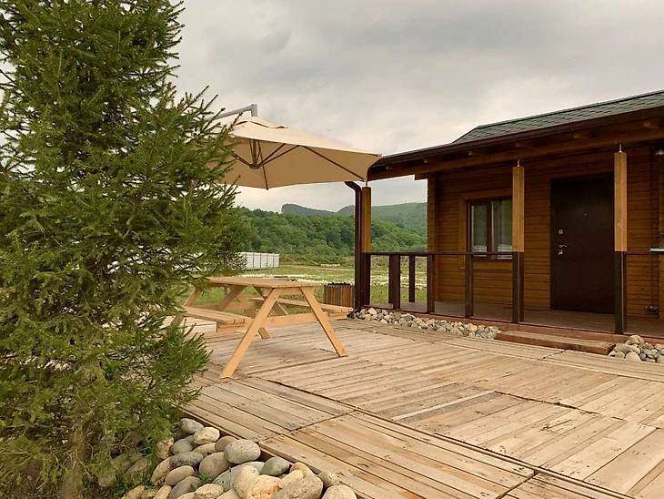 База отдыха находится в самом поселке Мостовской. Гости проживают в деревянных домиках, где минимальное размещение предполагает двух отдыхающих, максимальное — десятерых. В номерах есть телевизор, мягкая мебель, холодильник, душевая кабина и санузел. Питаться есть возможность на территории в кафе или воспользоваться общей кухней, где есть все, чтобы приготовить еду. Из развлечений отдыхающие могут посещать бассейн с термальной горячей водой с 7 до 23 часов, организуется бесплатная рыбалка в местном пруду, экскурсии в горы по отдельному запросу.
