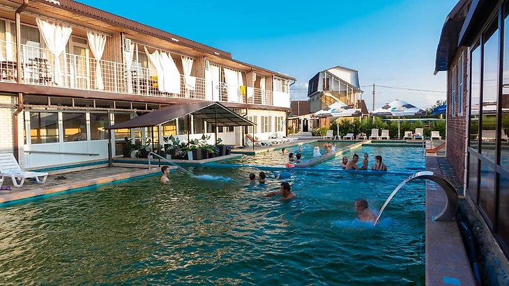Комплекс находится в поселке Мостовском, в нем есть три бассейна с термальной водой для взрослых и детей, поступает она из скважины, находящейся на глубине более двух километров. Два взрослых бассейна оборудованы гидромассажем, а в детском есть горки. Проживать можно в соответствии с бюджетным вариантом в номере категории «эконом» без удобств, но это всего лишь предполагает отсутствие санузла и душа, они общего пользования. Номера категории «стандарт» и «люкс» оборудованы всем необходимым. Зато в оплату любого номера включены завтраки.