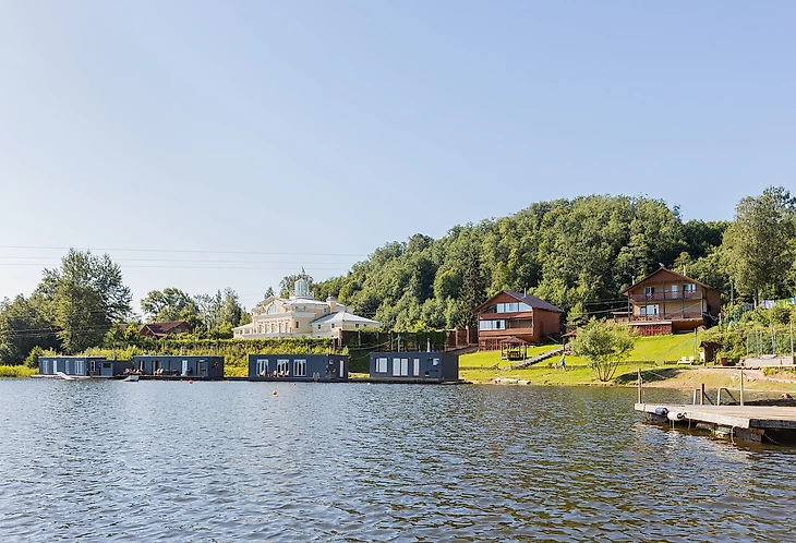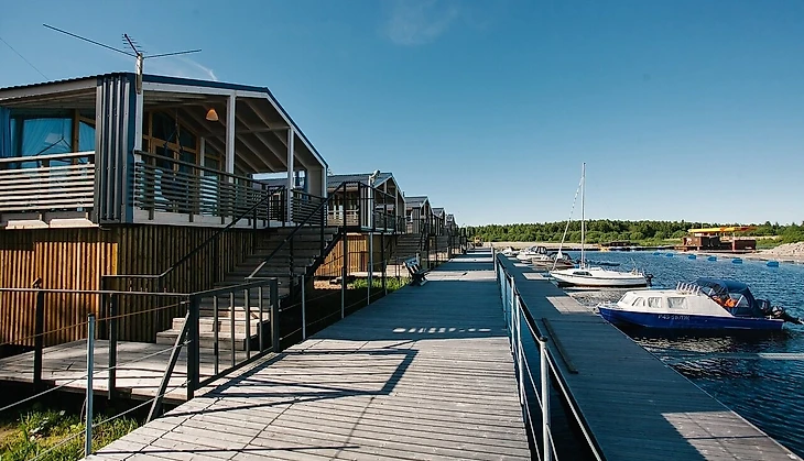 Для проживания отдыхающих обустроено несколько коттеджей. Они построены в скандинавском стиле с применением натуральных и безопасных материалов. Отдых в яхт-клубе сочетает спокойное пребывание на природе с активными водными развлечениями. Насладиться ароматным воздухом леса и местными красотами можно на конной прогулке. Есть просторная финская сауна, а также кафе, бассейн, баня, настольный теннис, площадка для пикника, детская площадка.