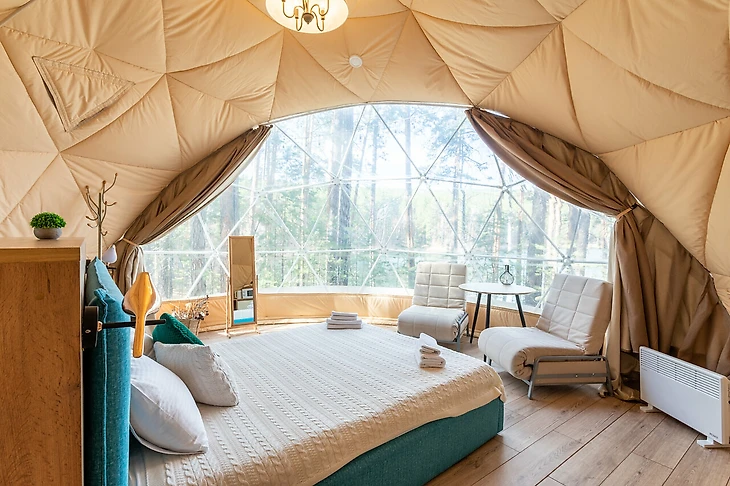Стоимость проживания — от 5 000 рублей в сутки за двухместный глэмп в скандинавском стиле
