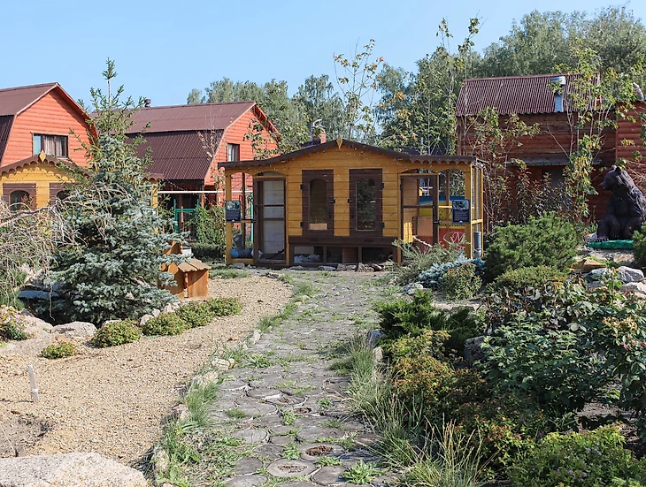Эко-парк расположен по соседству с гостевым комплексом «Приозерный» в живописном уголке Уральских гор на берегу озера Зюраткуль, которое можно считать высокогорным, ведь находится оно на высоте более семисот метров над уровнем моря. Его береговая линия вытянута на 26 километров. Проживание возможно в гостиницах эконом- и стандарт-класса, в одноэтажном коттедже комфорт-класса и восьми двухэтажных коттеджах. В коттеджах есть большая гостиная и кухня, на каждом этаже санузел, на первом этаже душевая комната. Самые бюджетные номера в гостинице эконом-класса.