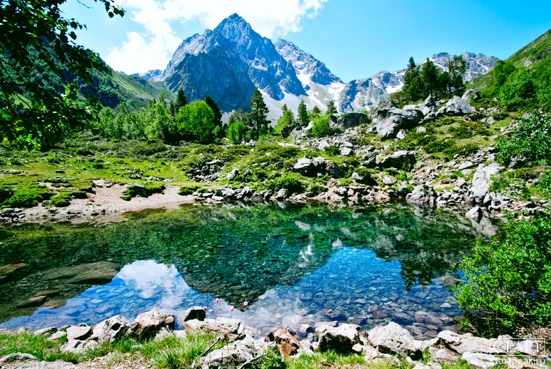 Следующее озеро привлекает сюда путешественников изумрудным цветом воды. Озеро необычной формы – его берега изрезанные. Сам водоем скрыт от глаз горными холмами. Температура воды, как во всех водоемах Архыза, холодная. Температура +13 градусов, и выше не подымается. Однако красота озера компенсирует все остальные недостатки, если их и считать таковыми.