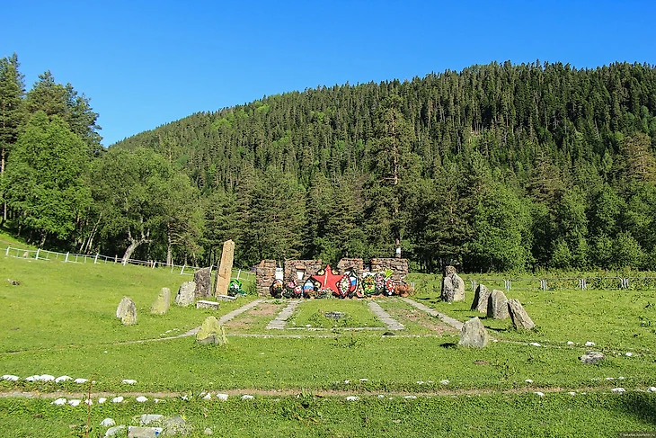 Здесь на поляне начинается тропа, которая ведет к водопадам и озерам. Здесь также расположен мемориальный комплекс «Штык». Его установили в честь защитников Кавказа, погибших в боях Великой Отечественной войны.