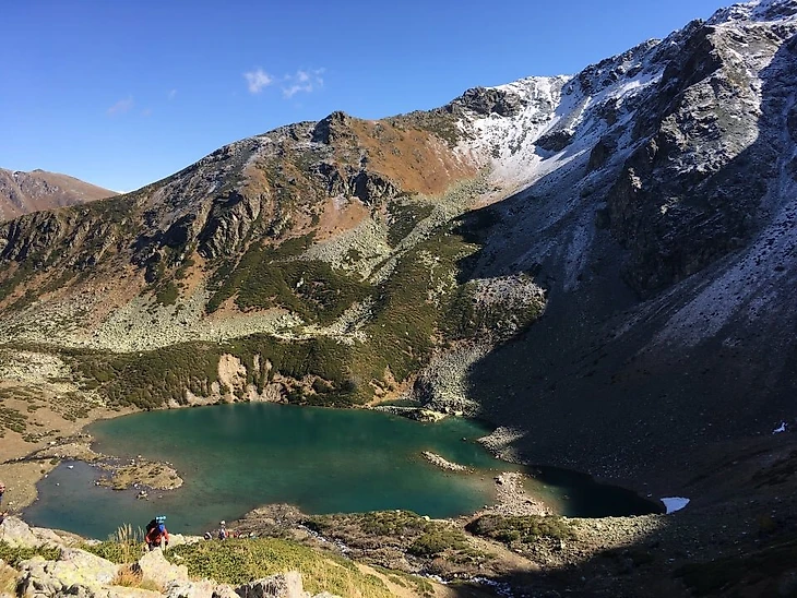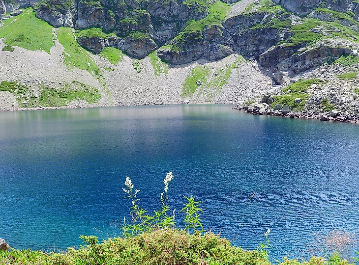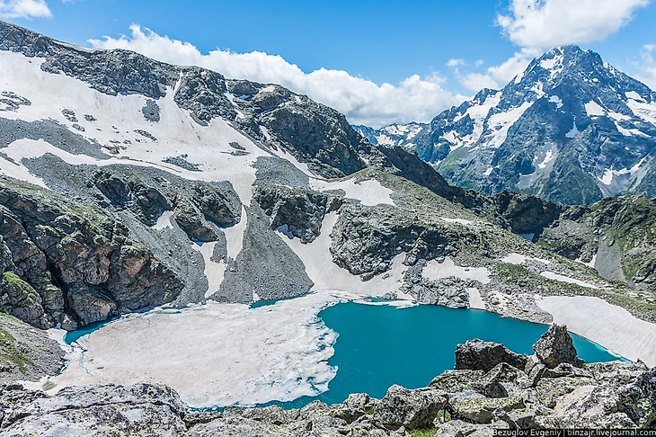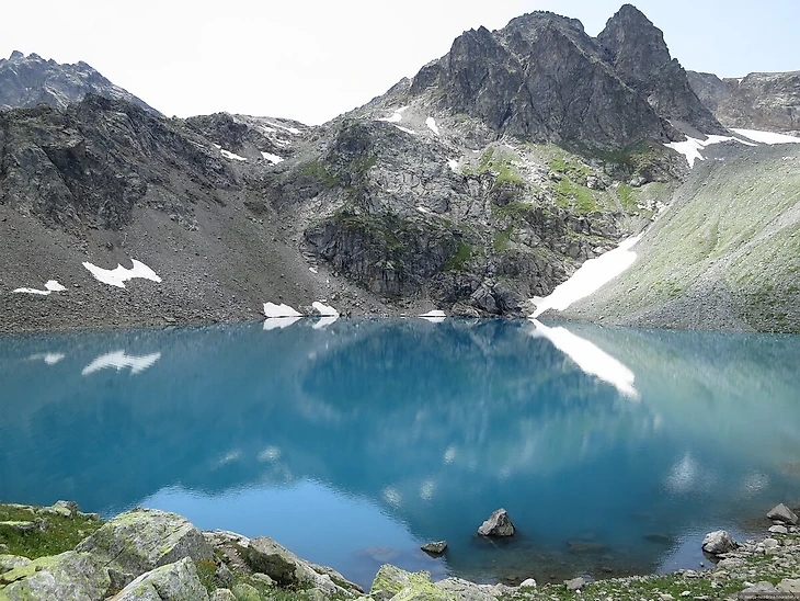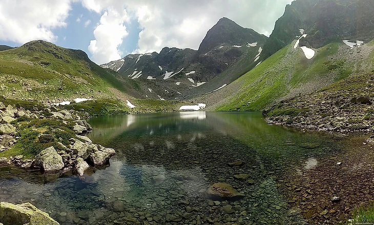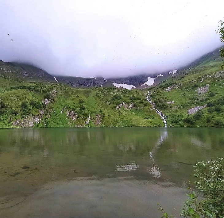 Это озеро находится в труднодоступном месте и тем не менее сюда тоже доходят туристы, которые желают увидеть озеро неземной красоты. Оно находится в окружении скал и кажется, что похоже на кратер вулкана. Вода в водоеме темная, серые камни и ледники создают неповторимую картину этого места. Чтобы сюда попасть, следует перейти через перевал Караджащ и увидеть перевал Аманауз и горные вершины Домбая.