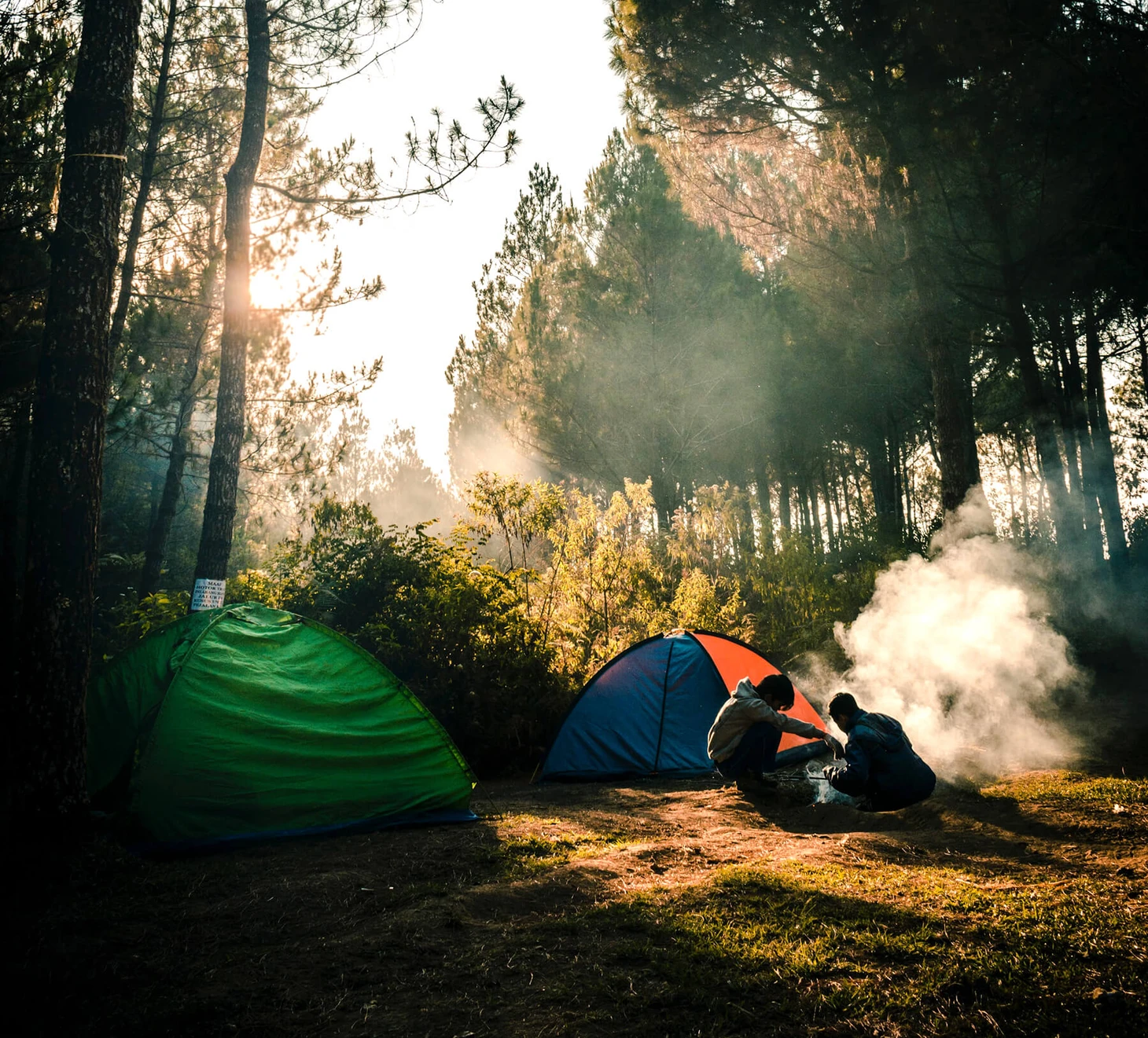 Дикарем. Туристы ставят палатки в лесу, в окрестностях курорта.