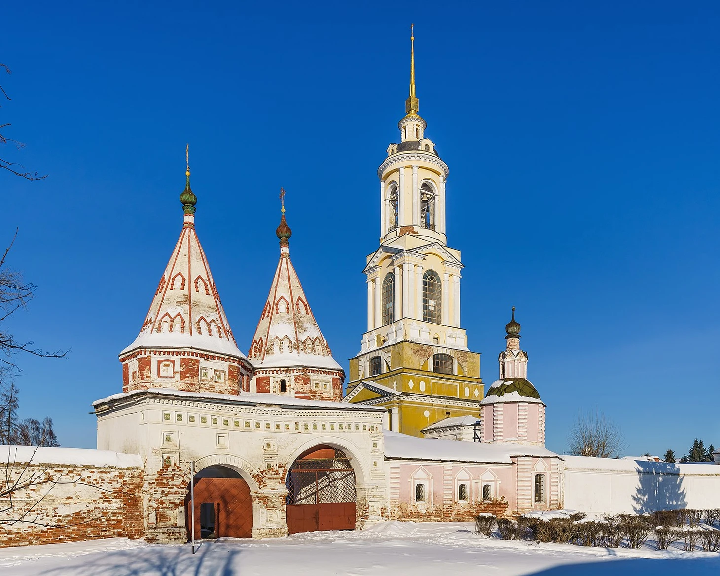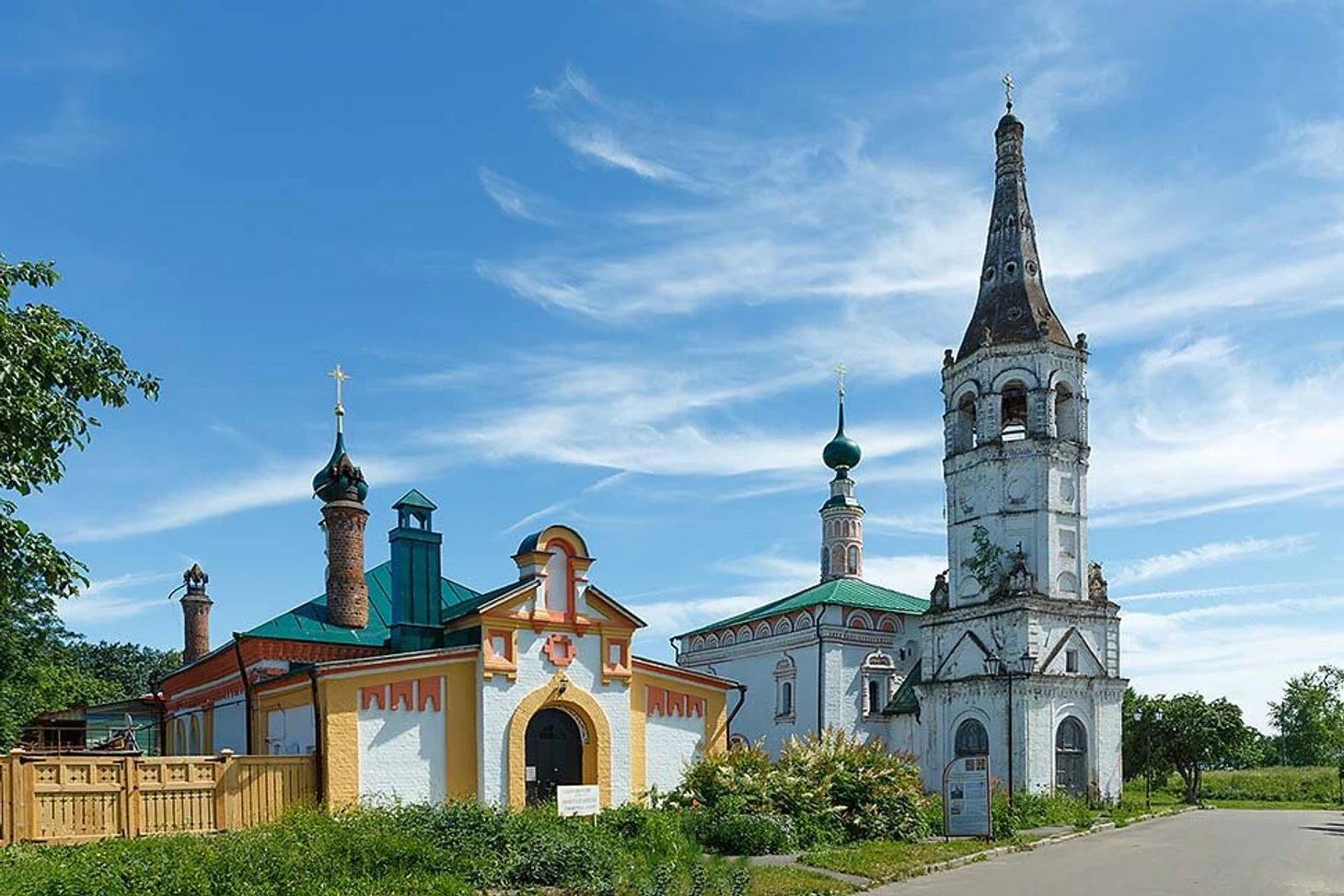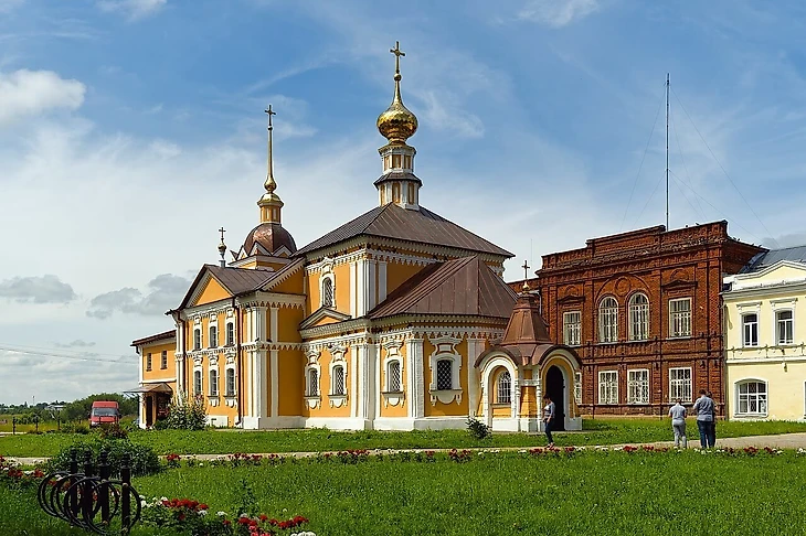 Еще один парный архитектурный ансамбль в нашем рейтинге. В 1709 году была построена каменная Смоленская церковь. Ее возведение было обусловлено потребностью для прихожан. При Спасо-Евфимиевом монастыре жило и работало много ремесленников и им нужна была церковь. В начале XIX столетия рядом со Смоленской церковью была построена Симеоновская церковь и колокольня. Это в совокупности со Смоленским храмом образует тот архитектурный ансамбль, который могут увидеть все гости Суздаля.