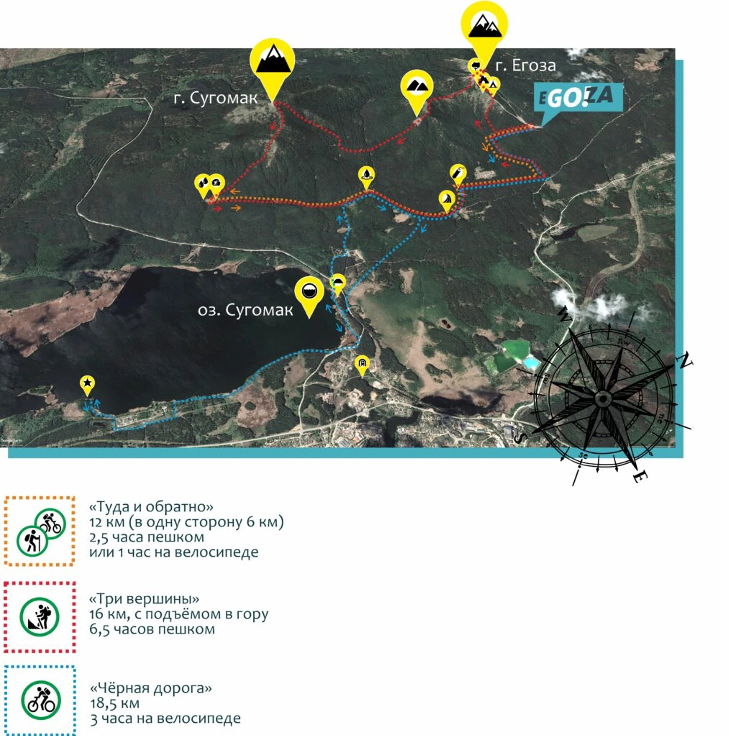 В 2022 году на горе проложили сеть пешеходных троп «Егоза — Сугомак». Всего представлено пять маршрутов для пешего и велотуризма. Маршруты объединили не только вершины, но и природную территорию вокруг них. У каждой тропы протяженностью от 1,4 до 18,5 километров свой цвет. Во время прохождения нужно ориентироваться на стрелки и метки на деревьях.