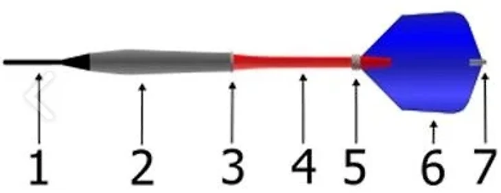 Основными частями дротика являются наконечник, баррель, хвостовик и оперение.
