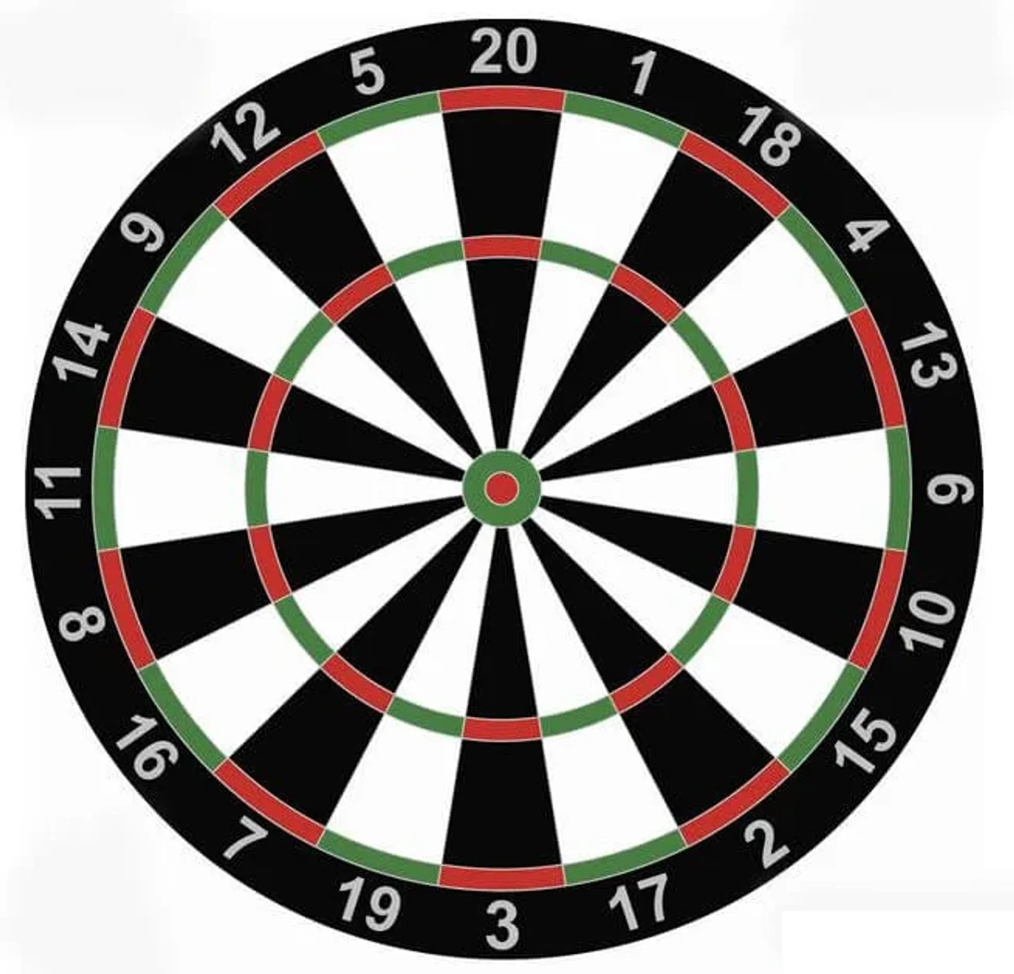 Мишень для дартса состоит из лузы (центра), нумерованных от 1 до 20 секторов вокруг и внешнего кольца, разделенного на 25 сегментов.