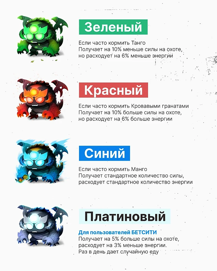 Еда влияет и на внешний вид Рошана. Тамагочи изменит цвет, если покормить его одним и тем же больше 5 раз. А за регистрацию в БЕТСИТИ открывается уникальный стиль – платиновый Рошан.