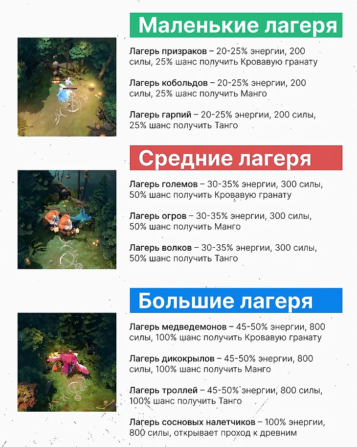 Вначале Рошан может охотиться только в маленьких лагерях. Чтобы попасть в более крупные, ему нужно стать сильнее: