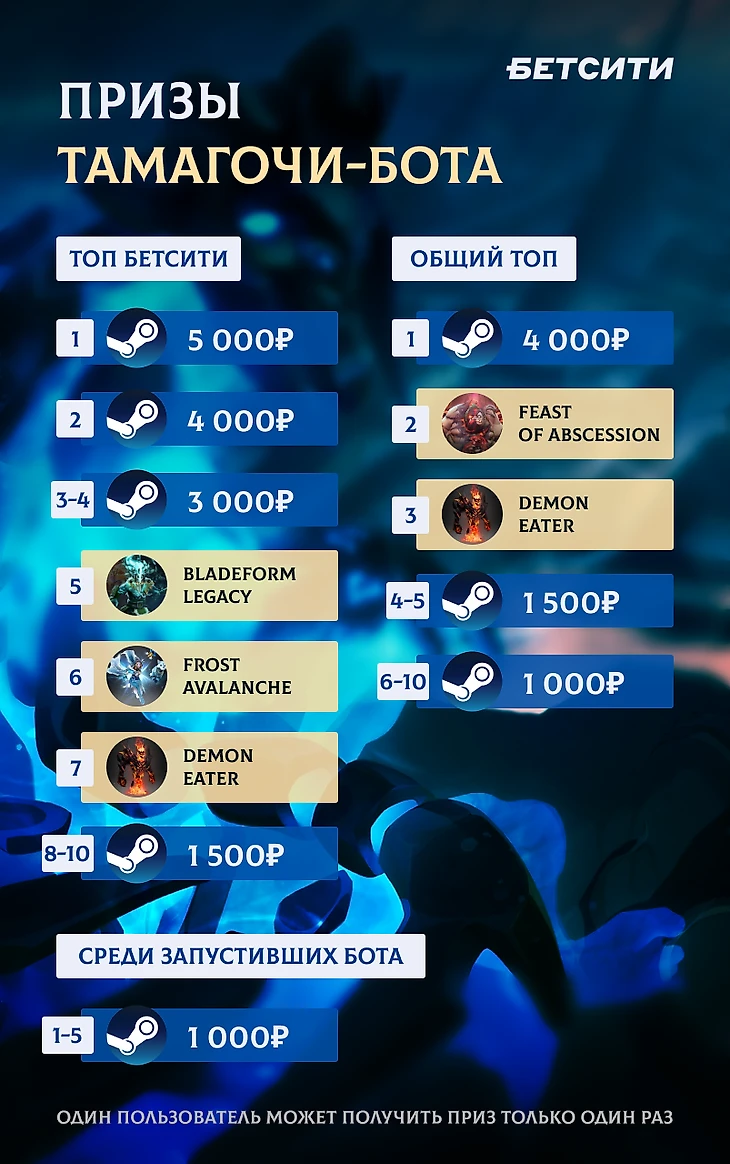Победителями общего топа станут 10 пользователей, которые набрали больше всего силы. Для тех, кто зарегистрируется в БЕТСИТИ, будут особые призы – их получат 10 пользователей с наибольшим количеством силы. А еще мы проведем случайный розыгрыш среди всех, кто играл в тамагочи.