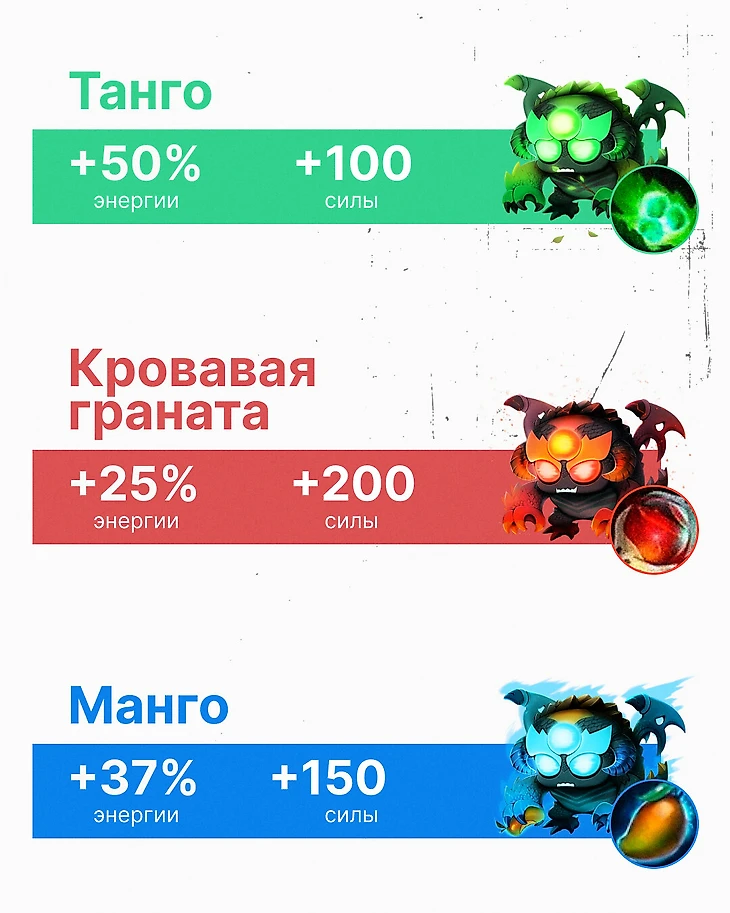 На выбор три варианта еды: Танго, Кровавая граната и Манго. Каждая дает разные бонусы: