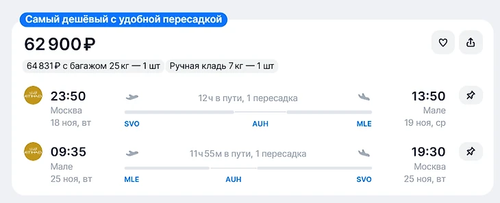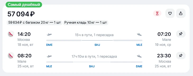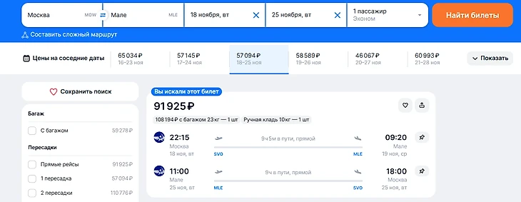 Единственной прямой рейс из Москвы в Мале на 18 ноября 2025 года (обратный 25.11.2025г.) будет стоить чуть больше 91 000 руб. с багажом весом 23 кг и ручной кладью 10 кг. Время в пути 9 часов.
