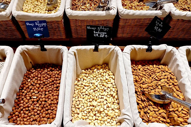 Вроде бы еще один неочевидный вариант, поскольку орехи продаются на любом рынке или во многих магазинах российских городов. Но все-таки совсем другое дело привезти орехи из Грузии. Они здесь гораздо дешевле, их огромный выбор и самые разнообразные виды. И потом, приехав домой, многие наверняка захотят приготовить какое-либо понравившееся блюдо грузинской кухни, а без орехов оно не получится.