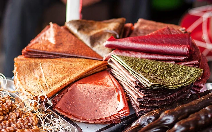Старшее поколение читателей наверняка помнит из детства яблочную пастилу с приятной кислинкой. Если вы хотите вспомнить вкус детства, да к тому же запастись, то все внимание грузинскому варианту пастилы, которая называется тклапи. Готовят ее не только из яблок, но также из сливы, алычи, абрикосов и других фруктов. Толщина пастилы не превышает трех миллиметров. Обратите внимание на прилавки магазинов, тклапи увидите сразу в виде трубочек самых разных цветов: желтого, зеленого, коричневого, красного. Вкус тот самый сладкий с кислинкой. В Грузии тклапи называют «кислым лавашем».