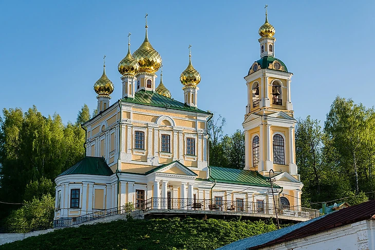 Плесский ансамбль Троицкой и Введенской церквей – это своего рода визитная карточка города, его «парадные ворота». Расположенные на въезде в Плес, они сразу же очаровывают своей архитектурной красотой и создают неповторимую атмосферу старины и уюта. Троицкая церковь, построенная в 1808 году в стиле барокко, является так называемым «холодным» храмом, где богослужения проводились только в теплое время года. Ее пышное убранство, украшенное искусной резьбой и позолотой, сразу же привлекает внимание.