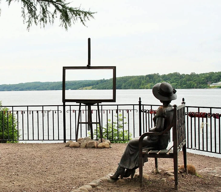 Скульптура, украшающая Плёс с 1988 года, хранит в себе трогательную и печальную историю любви, о которой знают далеко не все. Монумент посвящен Софье Петровне Кувшинниковой – женщине, сыгравшей особую роль в жизни художника Исаака Левитана. Их пути пересеклись в 1880-х годах, когда молодой Левитан, очарованный красотой волжских пейзажей, впервые ступил на плесскую землю. Софье Петровне, к тому времени уже разменявшей пятый десяток, суждено было стать не просто музой художника, но и его возлюбленной.