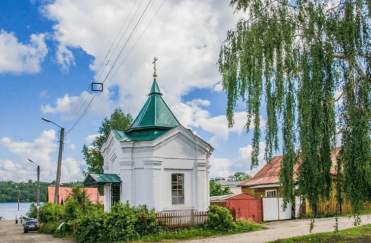 Часовня возведена в 1892 году в стиле русского зодчества. Восьмигранная часовня, словно искусно ограненный драгоценный камень, вписывается в волжской пейзаж с неповторимой гармонией. Простота форм очаровывает, а красота линий завораживает. Белоснежные стены, увенчанные небольшой главкой, контрастируют с изумрудной зеленью холмов, создавая картину умиротворения и величия.