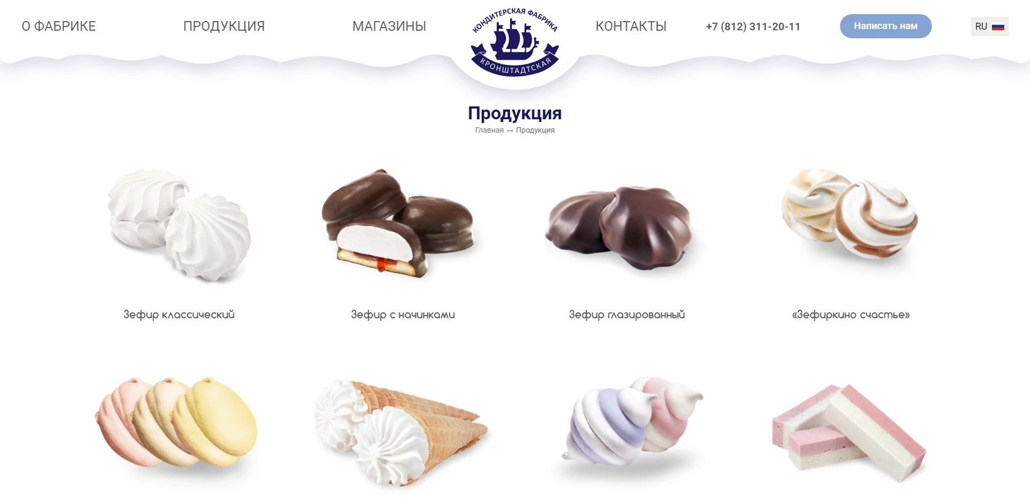 Безусловным лидером продаж является зефир – нежный, воздушный и однородный. Его рецептура отличается простотой и натуральностью: патока, сахар, фруктовое пюре, лимонная кислота, лактат натрия, яичный белок, пектин и ароматизаторы. Упаковка зефира лаконична, но узнаваема: картонные коробки, обтянутые прозрачной пленкой, в которых плотными рядами выложены разноцветные зефирки. Отличительной особенностью продукции Кронштадтской фабрики являются нежные пастельные оттенки и натуральный аромат, лишенный резких химических ноток. Это неудивительно, ведь в производстве используются исключительно натуральные ингредиенты. Например, в состав ассорти «Зефирное облачко» входят шоколад, пломбир, мандарин и черная смородина, а «Французский десерт» порадует сочетанием клубники, черники, яблока и апельсина.