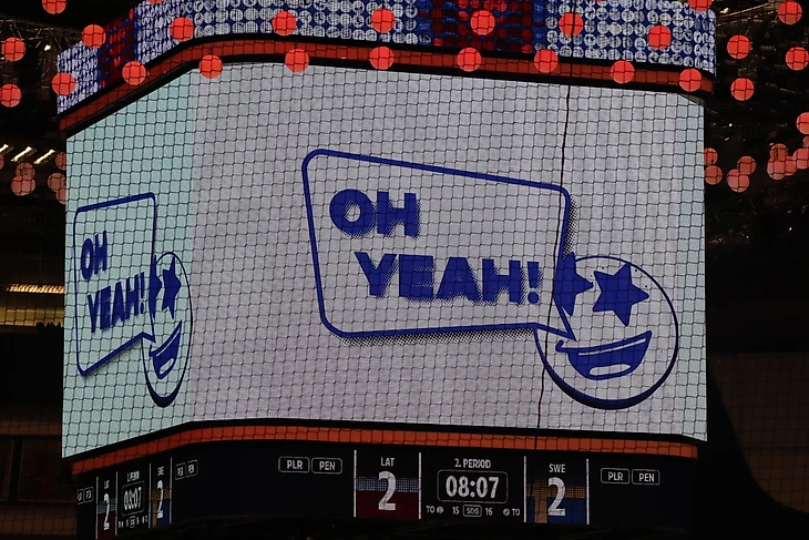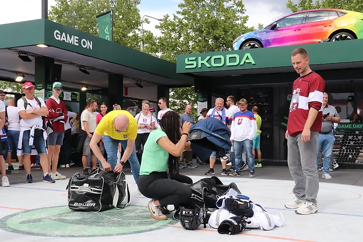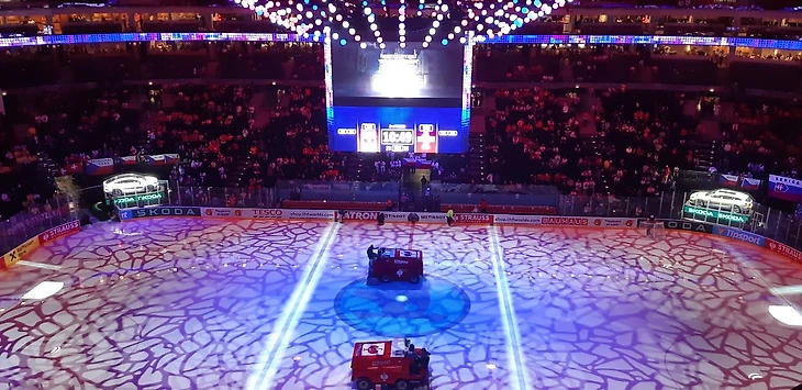 В Остраве на каждом матче работал ведущий, который свободно перемещался по всей арене с микрофоном и во время пауз «заводил» трибуны. В центре над ледовой площадкой установлен огромный медиакуб, на котором и происходил интерактив. Представление каждого игрока перед матчем на медиакубе было тоже «разогревом» для болельщиков. При этом в начале каждого периода идет объявление для болельщиков, что в случае если игровая шайба окажется на трибуне, то нужно отдать ее ближайшему стюарду так как в ней установлен чип для подсчета скорости шайбы и прочие умные функции. Не обходят стороной и красивых болельщиц, выводя на экран во время коммерческой паузы: «The beauty of hockey» и под комплименты ведущего красавицы могут передать привет, увидев себя на медиакубе. «Kiss cam» (поцелуи на камеру), хоккейный квиз в перерывах между периодами, розыгрыши официальной атрибутики во время пауз в игре, шумомер, награждение волонтера дня – это вызывало живую реакцию трибун. Правда, не было традиционного танца арбитра, когда на медиакуб выводится анимация с жестами арбитра, включается музыка и болельщик, которого выводят на экран, повторяет за «арбитром». Зато новые «фишки» получились креативными и веселыми.