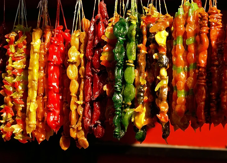 Кто бы мог предположить, что чурчхела станет вызывать исключительно ассоциацию с отдыхом на черноморском побережье, поскольку на открытых пляжах всегда можно встретить торговцев, которые продают эту сладость. «Родом» чурчхела тоже из Грузии, но затем продукт распространился по всему Кавказу и добрался до Ближнего Востока. Основными классическими ингредиентами считаются виноградный сок и орехи, но теперь виноградный сок может заменить любой другой, поэтому и цвет у чурчхелы бывает самым разным.