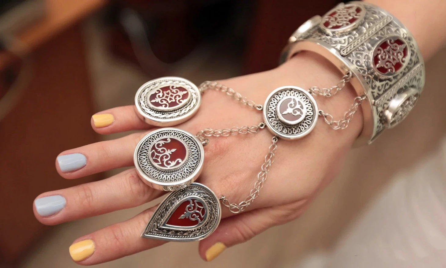 Если хотите приобрести серебряное изделие именно с национальной тематикой, то обратите внимание на саукеленин сыргаса, так называют подвески к головному убору невесты, о котором мы рассказывали выше. Продаются серьги в виде больших монет — шолпы. Считается, что они могут приносить достаток и счастье в дом владелицы. Особой популярностью у жительниц Казахстана пользуются большие широкие браслеты билезик, которые можно носить как на запястье, так и на лодыжке. Конечно же, каждое такое изделие украшается национальными орнаментами. Обратим внимание мужчин на то, что подобное украшение всегда будет отличным подарком для женщины.