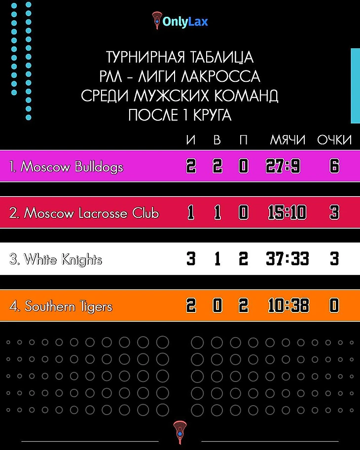 Результаты мужских матчей: Moscow Lacrosse Club — 15:10 — White Knights White Knights — 19:9 — Souther Tigers Bulldogs — 9:8 — White Knights Bulldogs — 19:1 — Souther Tigers