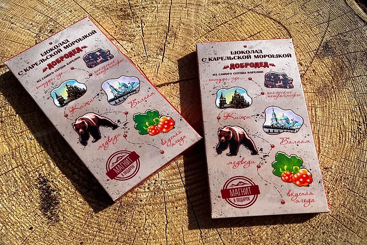 Еще компания «Добродед» изготавливает фирменные сладости. Если вы еще не выбрали, что привезти из отпуска, то рекомендуем обратить внимание на шоколад с карельской морошкой. В состав сладости входит сухое молоко, какао-масса, сахар, сушеная морошка и другие ингредиенты. Шоколад обладает приятным и непохожим на другие десерты вкусом. В продаже представлены плитки по 150 грамм.