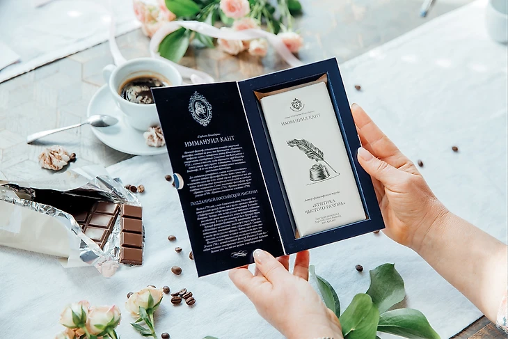 Компания реализует свою продукцию почти во всех крупных и маленьких магазинах области. Шоколад фасуют в картонную коробку, которая открывается как книжка. На развороте вы можете прочитать краткую информацию о шоколаде и кому он посвящен.
