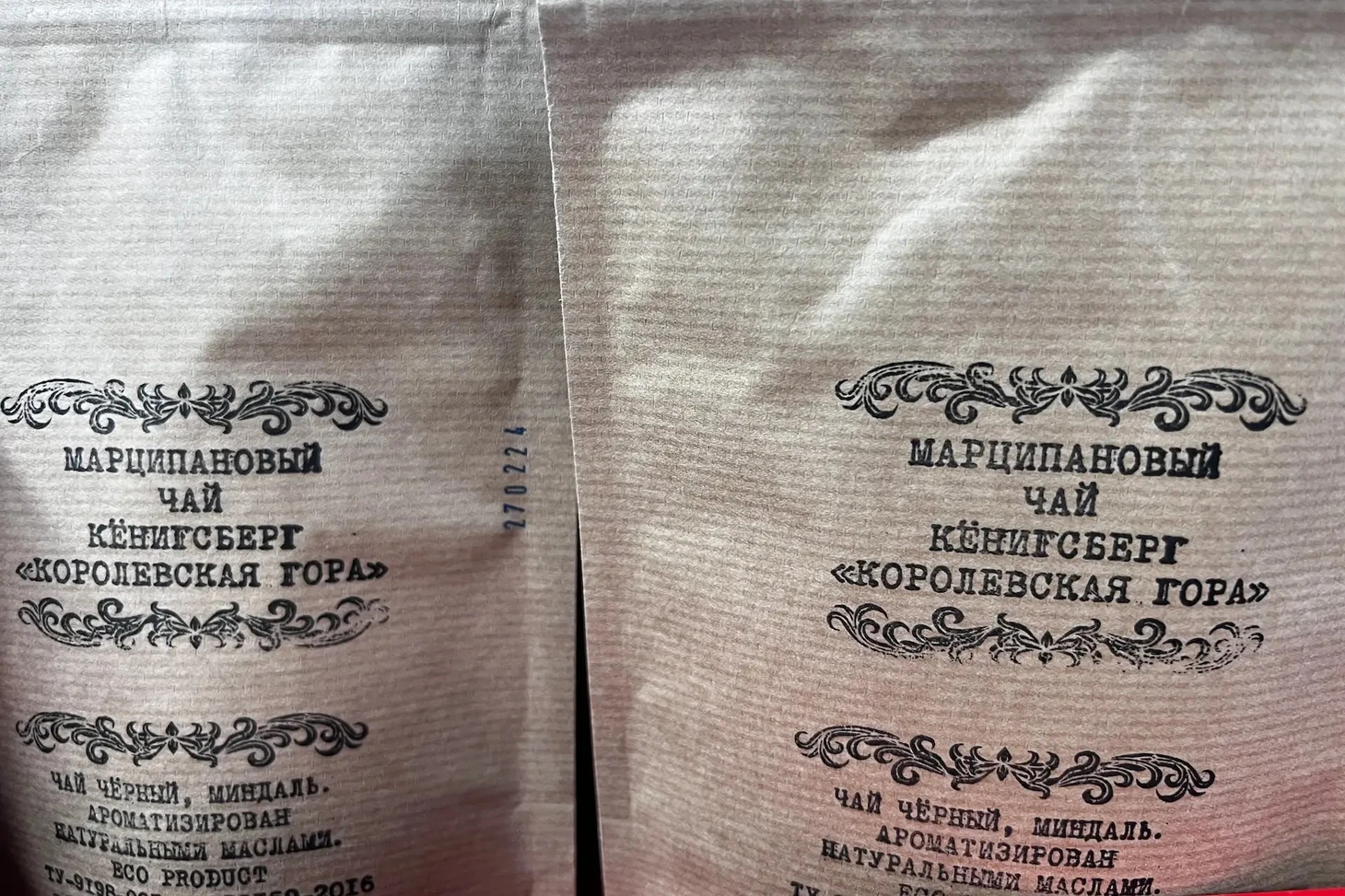 В Калининграде марципан не только едят, но и заваривают. Марципановый чай — необычный презент, который придется по вкусу всем ценителям необычных сочетаний. В основе продукта лежит перетертая миндальная масса с сахаром в пропорции 4 к 6. Чай заваривают с добавлением марципанов вместо с сахара. В готовой продукции содержится миндальная стружка.