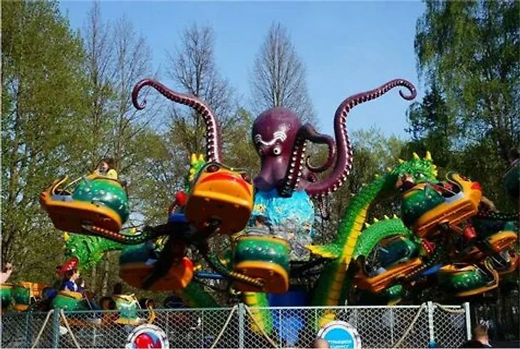На поезде можно добраться до большой карусели «Дракон». Крылатый ящер поднимает гостей на большую высоту и начинает кружить их в стремительном полете. Аттракцион предназначен для взрослых и школьников.