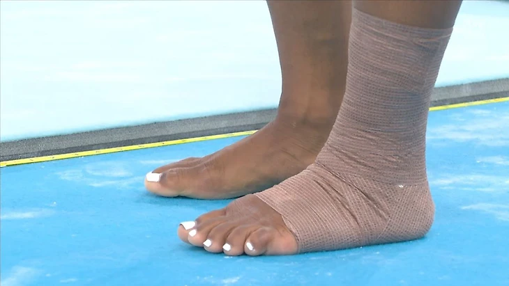 Она вышла с внушительным тейпом вокруг правой стопы, пятки и голеностопа.