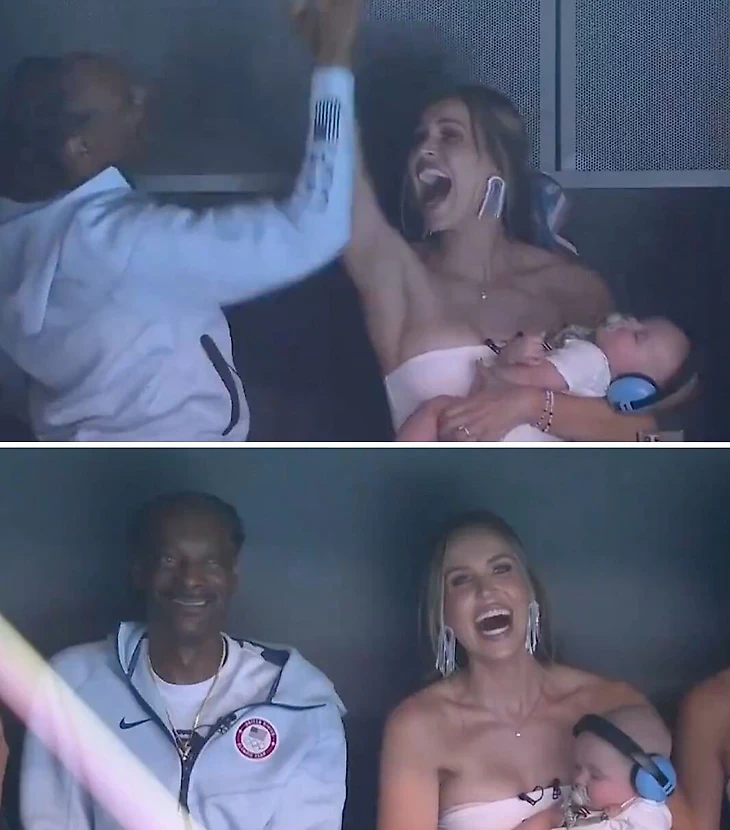 Фестиваль плавания продолжился уже на трибунах. Так Снуп праздновал золото сборной США в эстафете 4x100 вольным. Рядом – жена уже восьмикратного олимпийского чемпиона Калеба Дрессела с сыном на руках.
