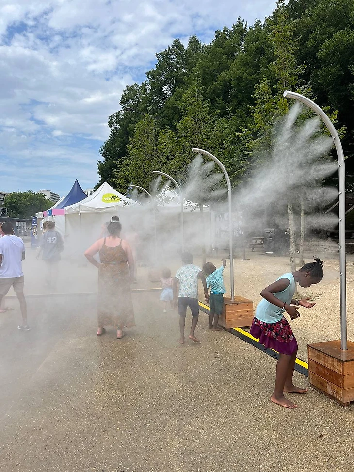 Люди активно болеют за своих. Есть где перекусить, установлены биотуалеты. Можно охладиться под распылителями.