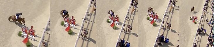 После полуминуты удачных прыжков через препятствия лошадь повела себя странно, в итоге у шведа не получилось направить ее, куда нужно, и она скинула наездника, когда чуть не врезалась в фигуры талисманов Олимпиады. И убежала в другую сторону.