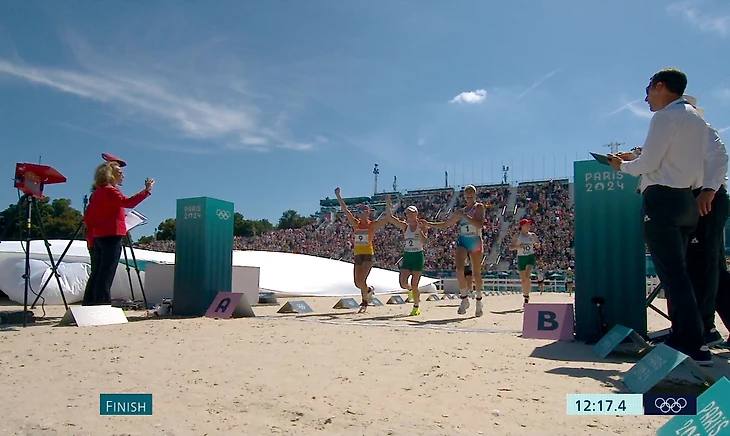 Это полуфинал, лидеры с запасом были уверены в квалификации – и на финише лазер-рана, которым завершается современное пятиборье, взялись за руки.