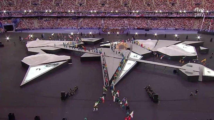 На поле «Стад де Франс» – фигуры в виде карты мира. Сейчас спортсмены по ней распределятся видимо